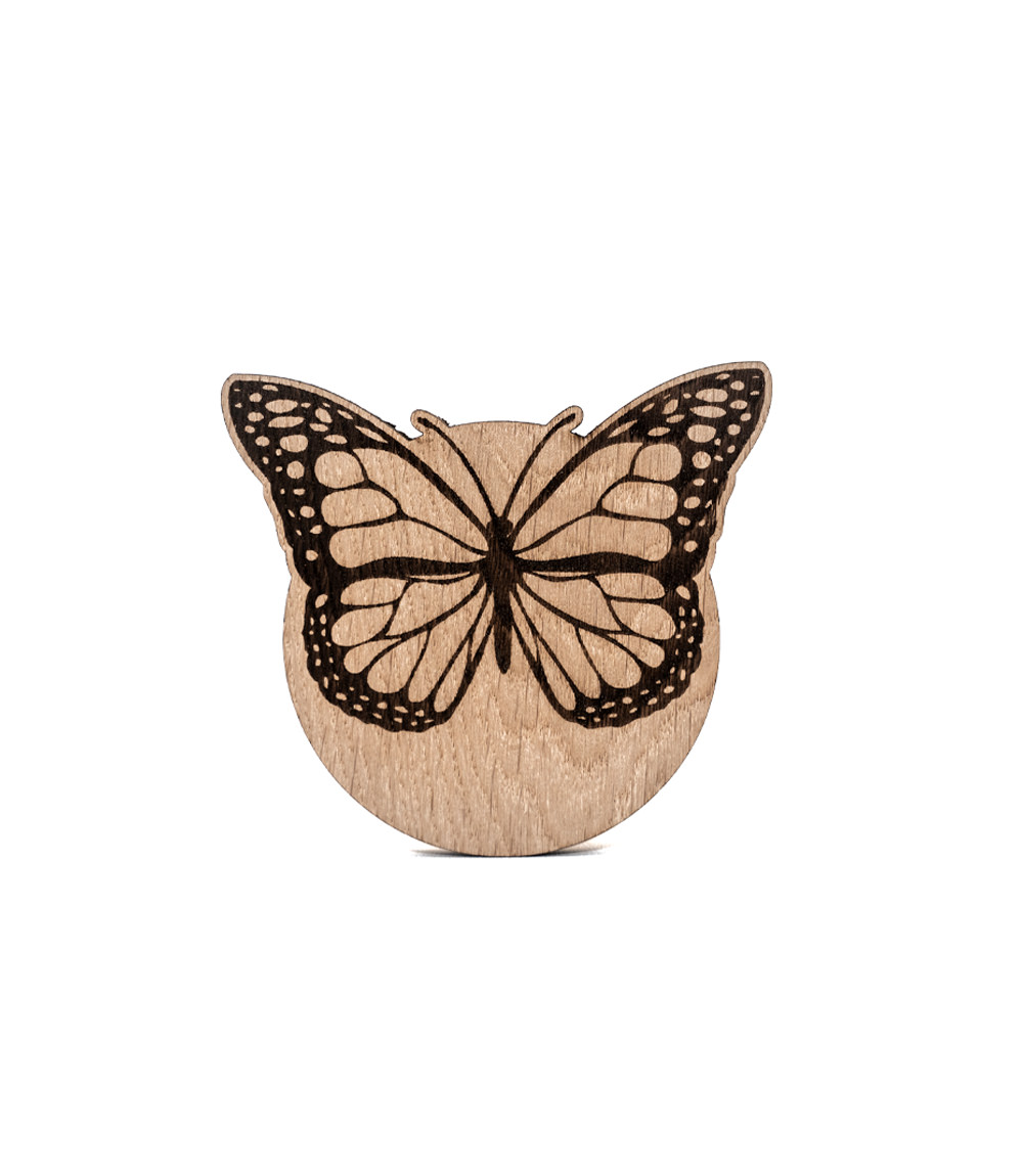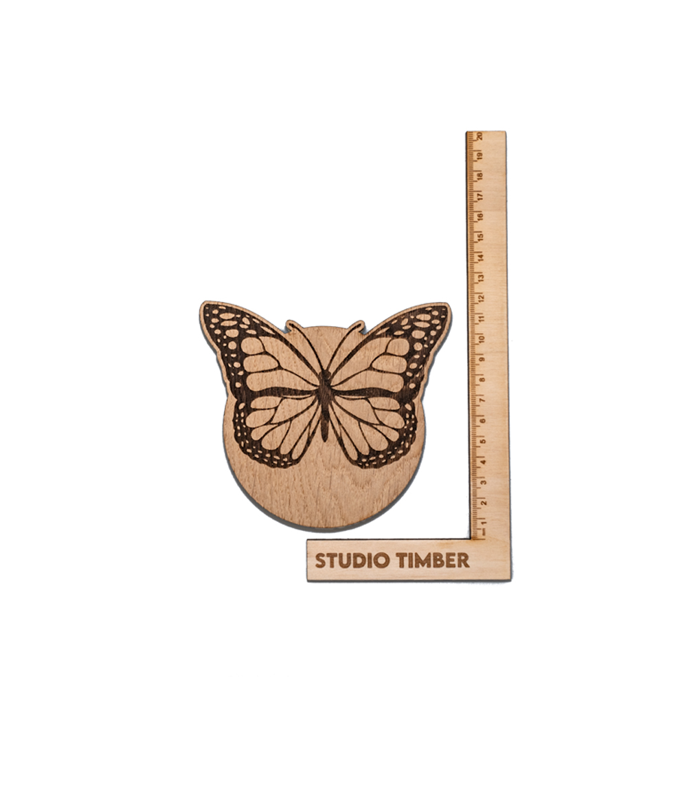 A round wooden butterfly coaster, approx 10cm x 14cm in footprint, 6mm thick.