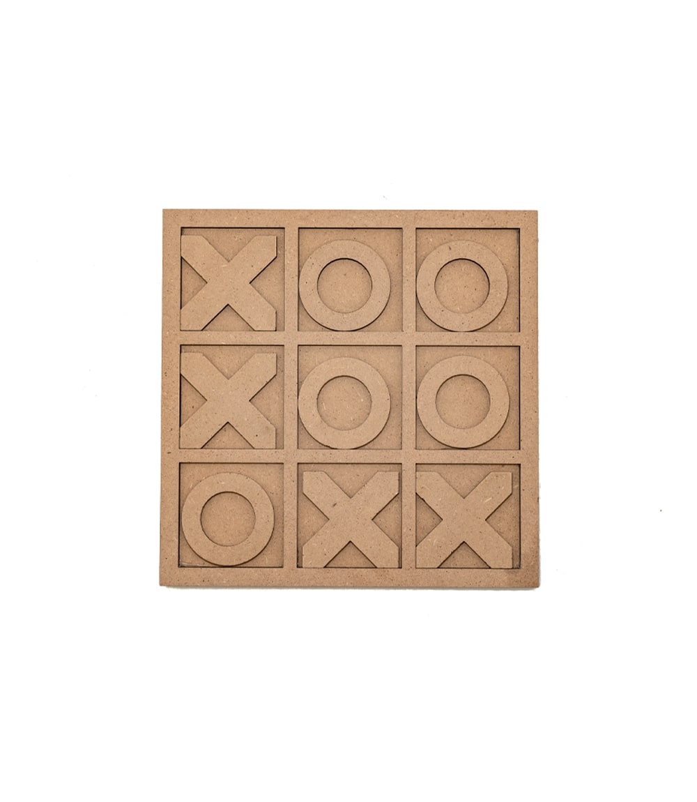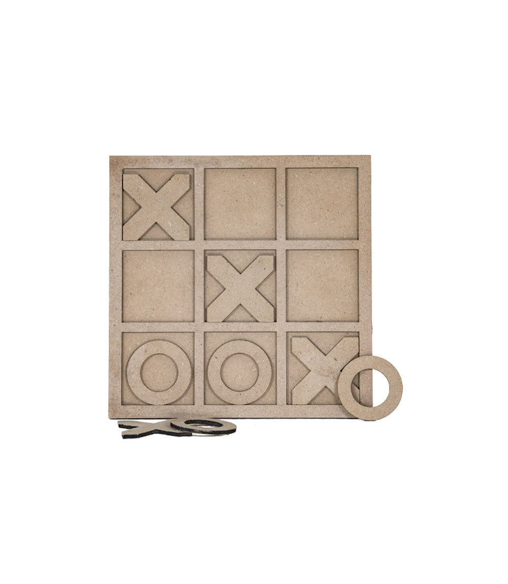 A wooden connect 3 game, approx 12cm x 12cm in footprint, 4mm thick.