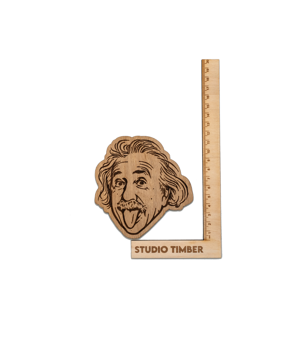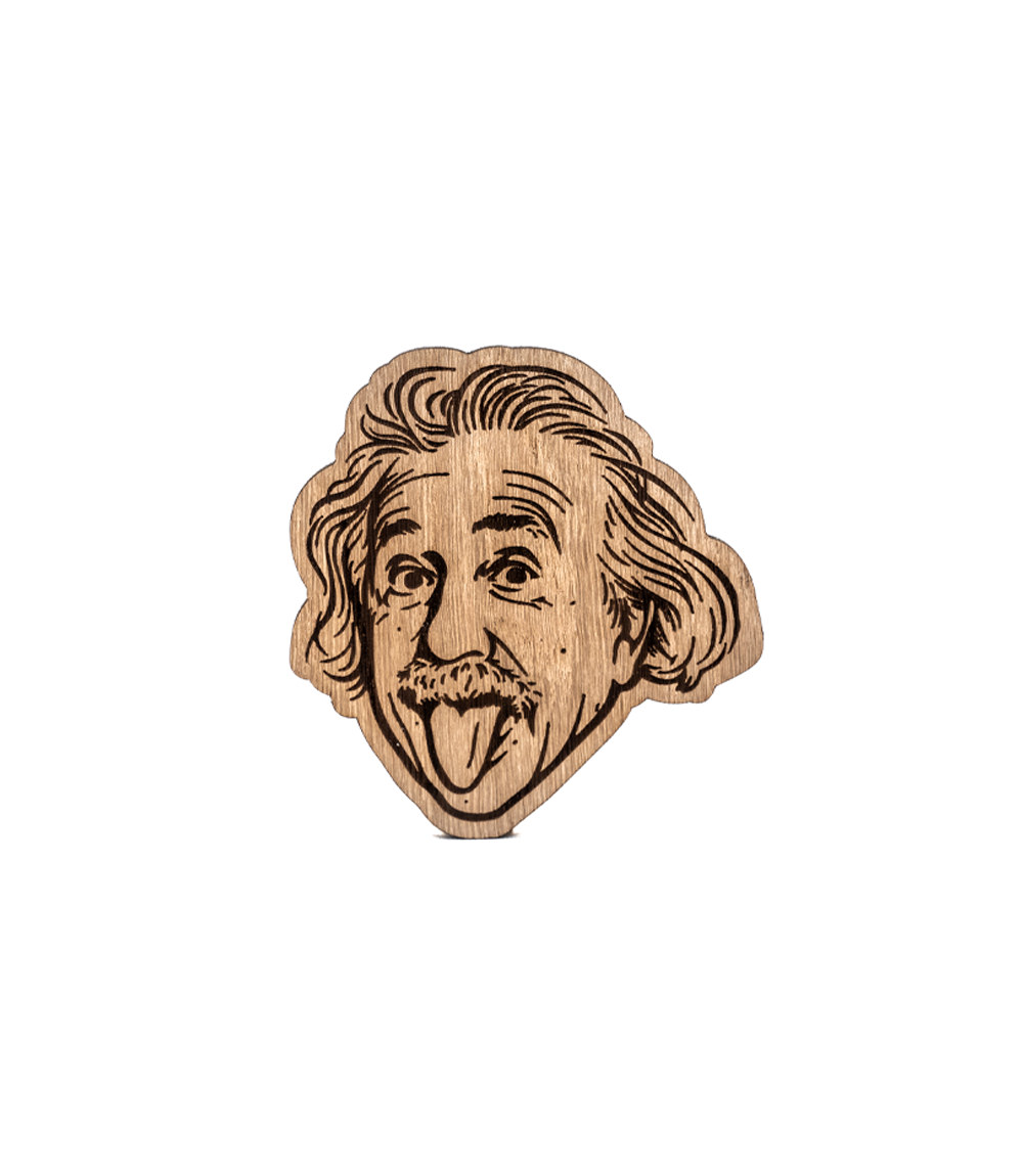 A round wooden Einstein coaster, approx 10cm x 14cm in footprint, 6mm thick.