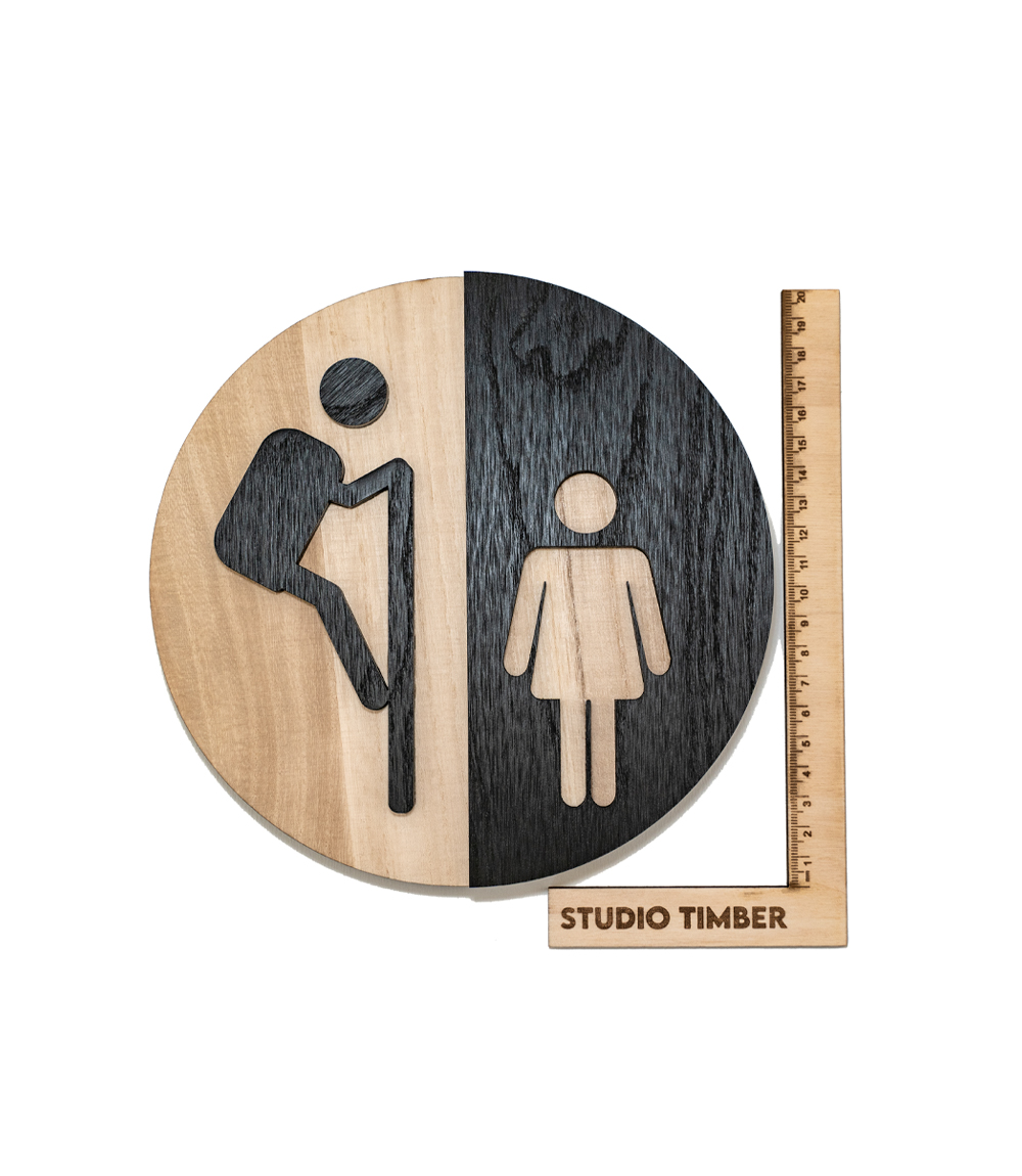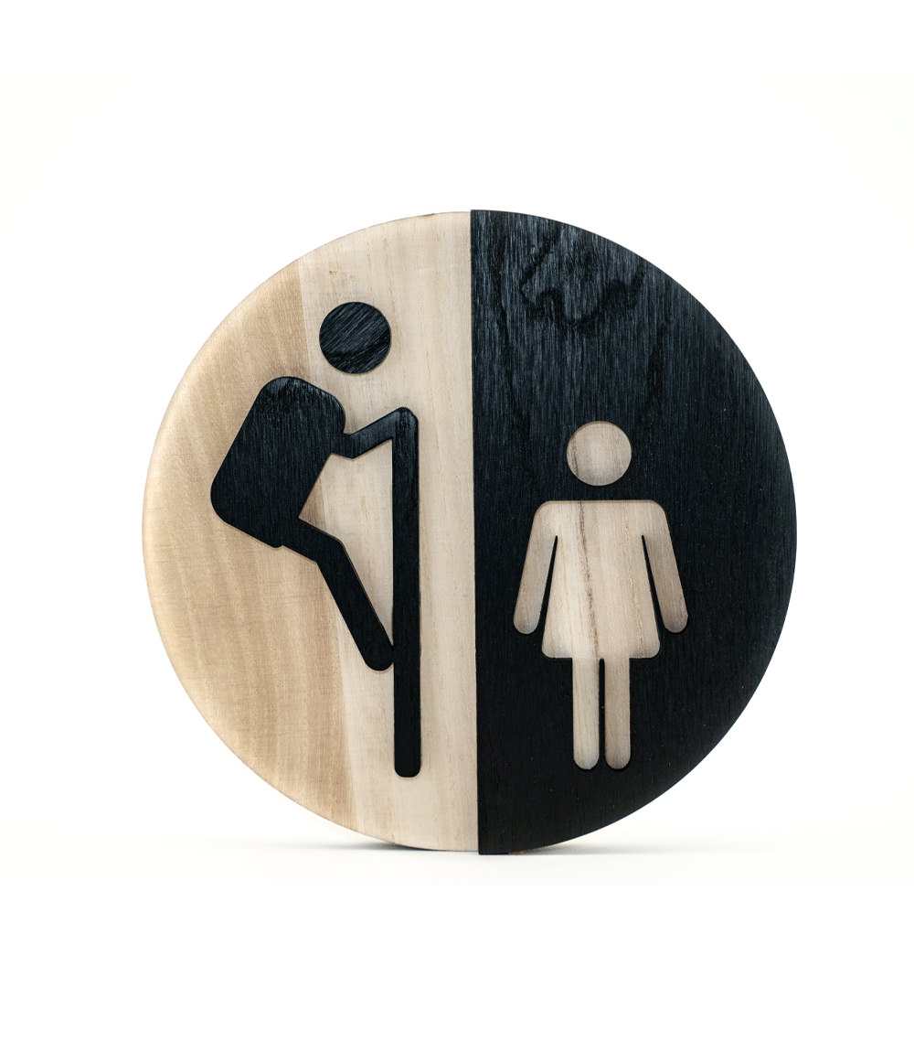 A round wooden Voyeur Toilet Sign, approx 20cm x 20cm in footprint, 2cm thick.
